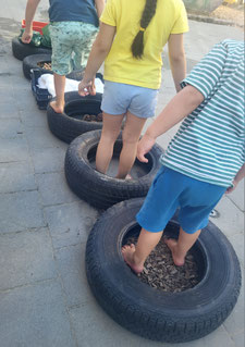 Lernende haben gemeinsam ein Angebot für die älteren Kinder geplant. Die Wahl ist auf einen Barfussweg gefallen. Mit viel Freude und Interesse wird er genutzt.