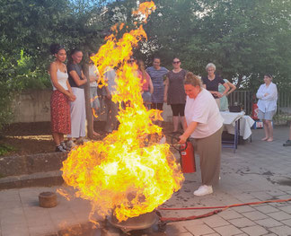 Mit einem externen Fachmann hat das Team eine Brandschutzschulung in der Kita absolviert. Der korrekte Umgang mit Löschdecke und Feuerlöscher war eindrücklich.